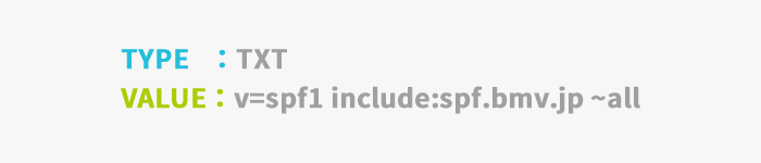 【Xserverの場合】 1.サーバーパネルの「DNSレコード設定」からドメインを選択。 2.「DNSレコード追加」タブより、 【種別】TXT を選択。 【内容】v=spf1 include:spf.bmv.jp ~all を記述。 すでにSPF レコードを設定済みの場合は、include:spf.bmv.jpを追記してください ※gmail.comやyahoo.co.jpなどのフリーメールは、各ISPがドメインを管理しているためSPF設定ができません。 ※SPFレコードの設定については、サポート対象外となりますので、ご利用のサーバー会社へお問い合わせください。