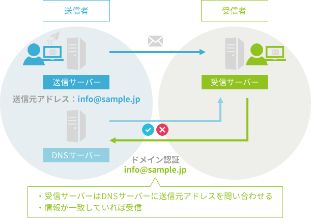 ※DNSサーバー:sample.jpなどのドメイン名とIPアドレスを紐づけているサーバー ※SPF:Sender Policy Framework